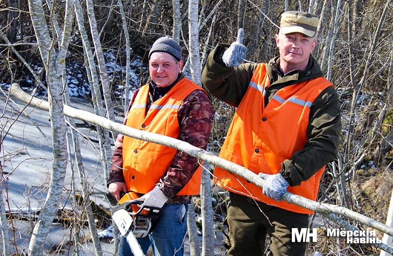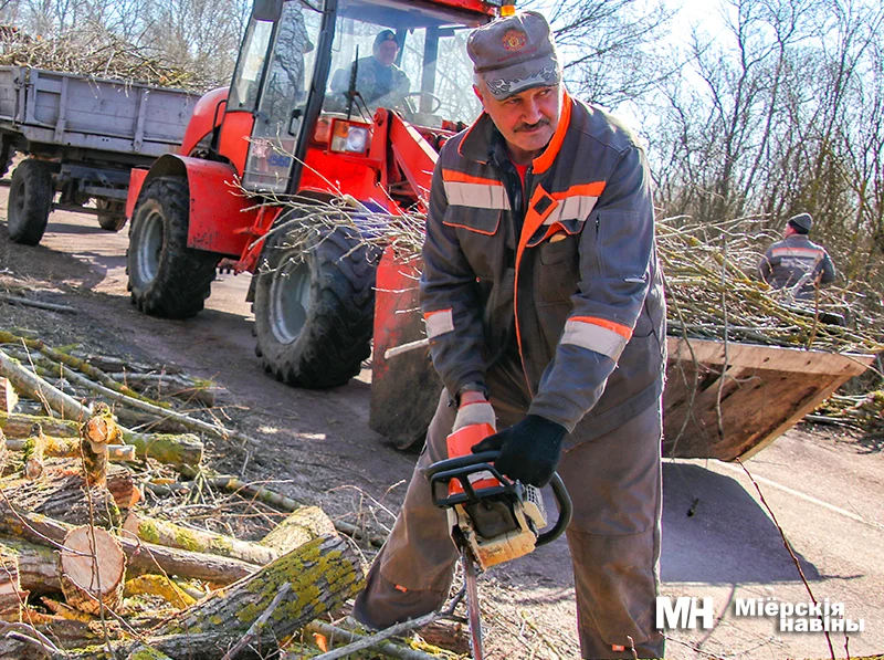 Крыху далей на ачыстцы прыдарожнай паласы працуюць работнікі ДРБУ № 203. Начальнік Руслан Смірноў заўважае, што на іх рахунку ўсе 820 кіламетраў дарог у раёне і высечка драўнінна-хмызняковай расліннасці – пастаянны клопат калектыву. Аднак рэсурсаў на ўсё не хапае, таму ў дапамогу вялікая дружная каманда з розных працоўных калектываў. Сёння сілы прадпрыемства раздзяліліся: хтосьці працуе тут, занята брыгада на ўкладцы асфальта ў Чэрасах, а тры чалавекі яшчэ з ночы пачалі сыпаць шляхі пясчана-солевай сумессю, каб папярэдзіць галалёд. Да таго ж фарміруюць абочыны і ўбіраюць смецце. На сваёй тэрыторыі парадак навялі даўно, засталося пачакаць цёплага надвор’я, каб разбіць кветнікі.